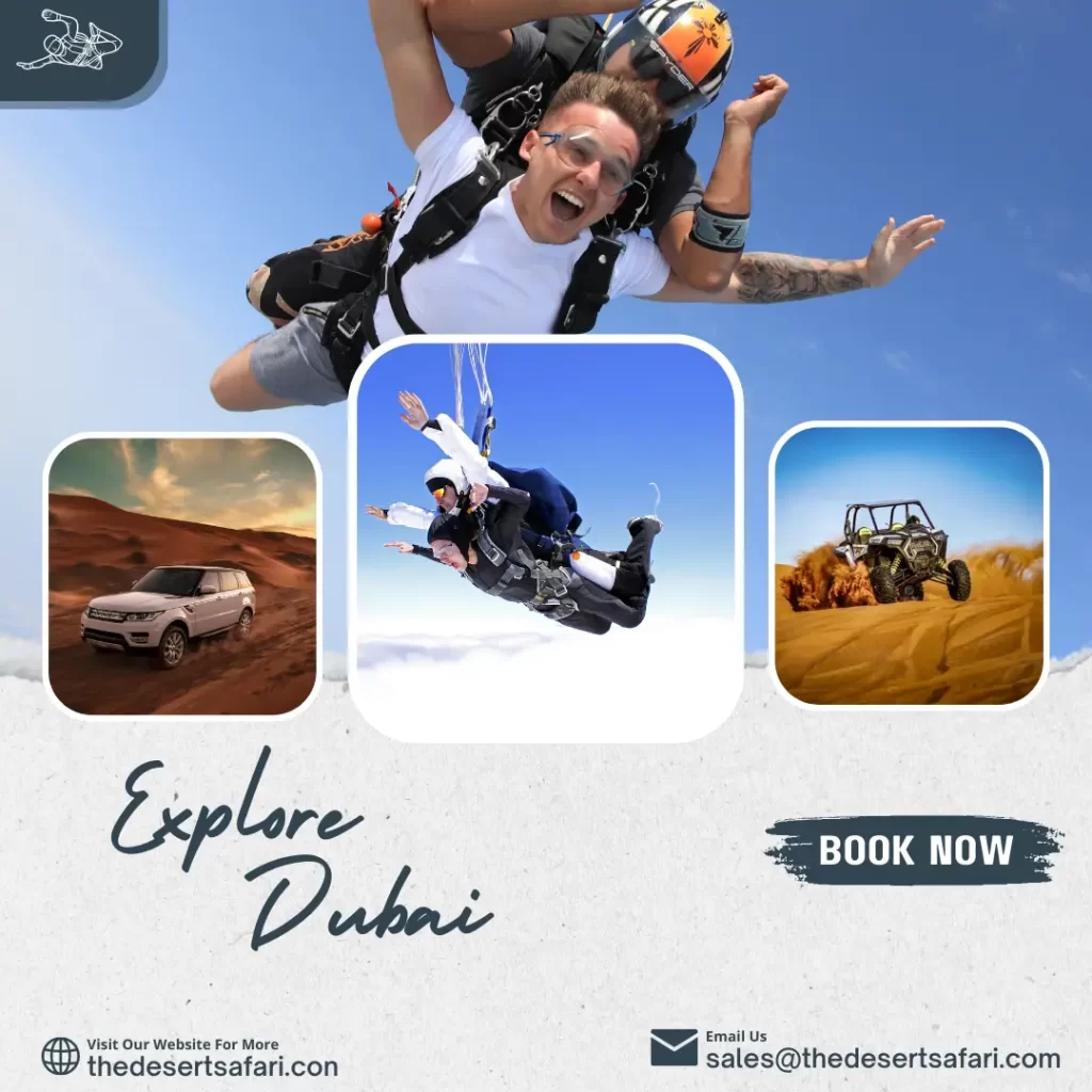 Get your adrenaline pumping with this combo package. Experience the thrill of skydiving over the Arabian Desert, followed by a thrilling desert safari with dune bashing, camel riding, sandboarding, and a traditional barbecue dinner.